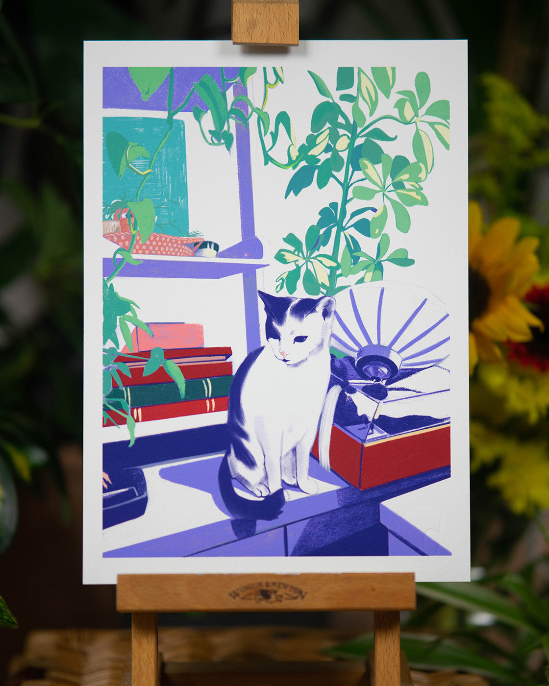 Nik: I was feeling very inspired by one of our Georgina Leung prints last summer. I wanted to create something that captured a similar cosy home feeling. The things that feel peaceful to me are music, the plants, and the cats.